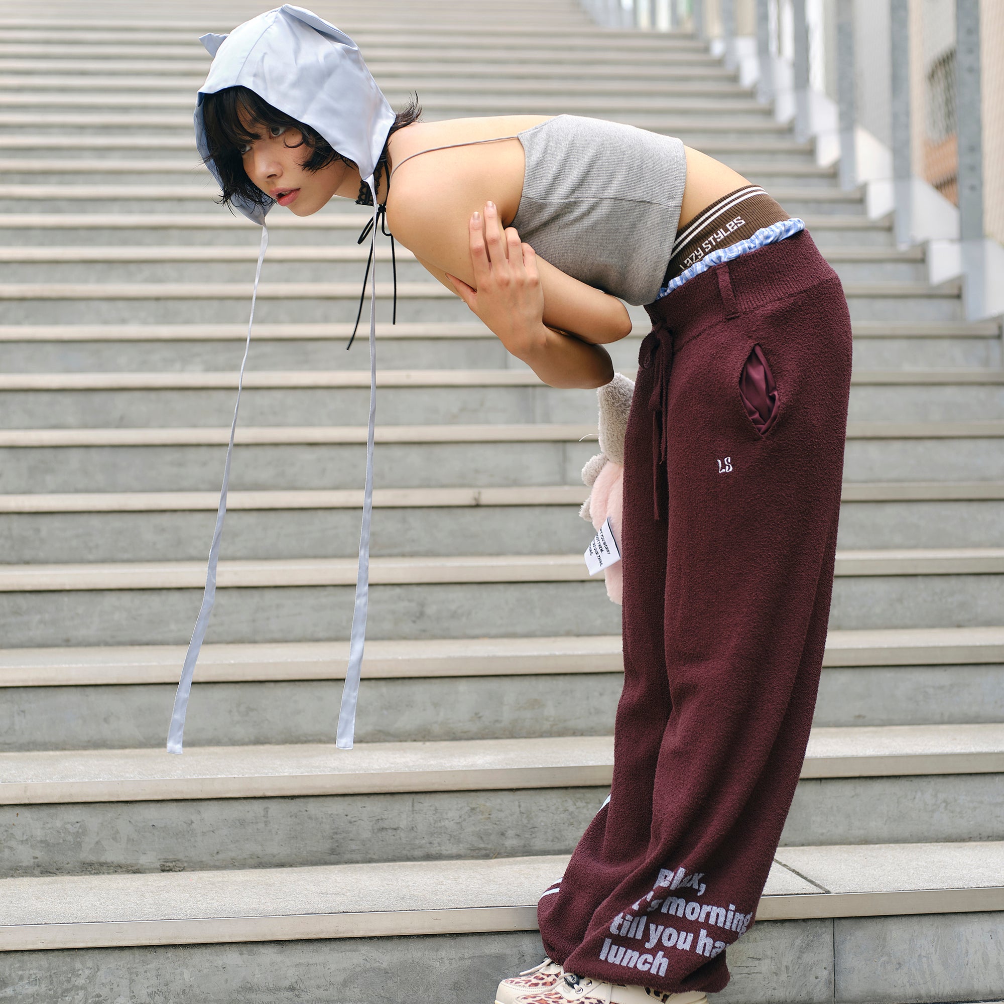 「 朝起きて、トランクスで寝てたから、そのままパンツをオン!っていうレイヤードにしました。 今日は「かわいいけどリラックス」なスタイル。質感がタオルみたいで癒されるパンツは、やる気が出ない日にぴったりだと思います。」